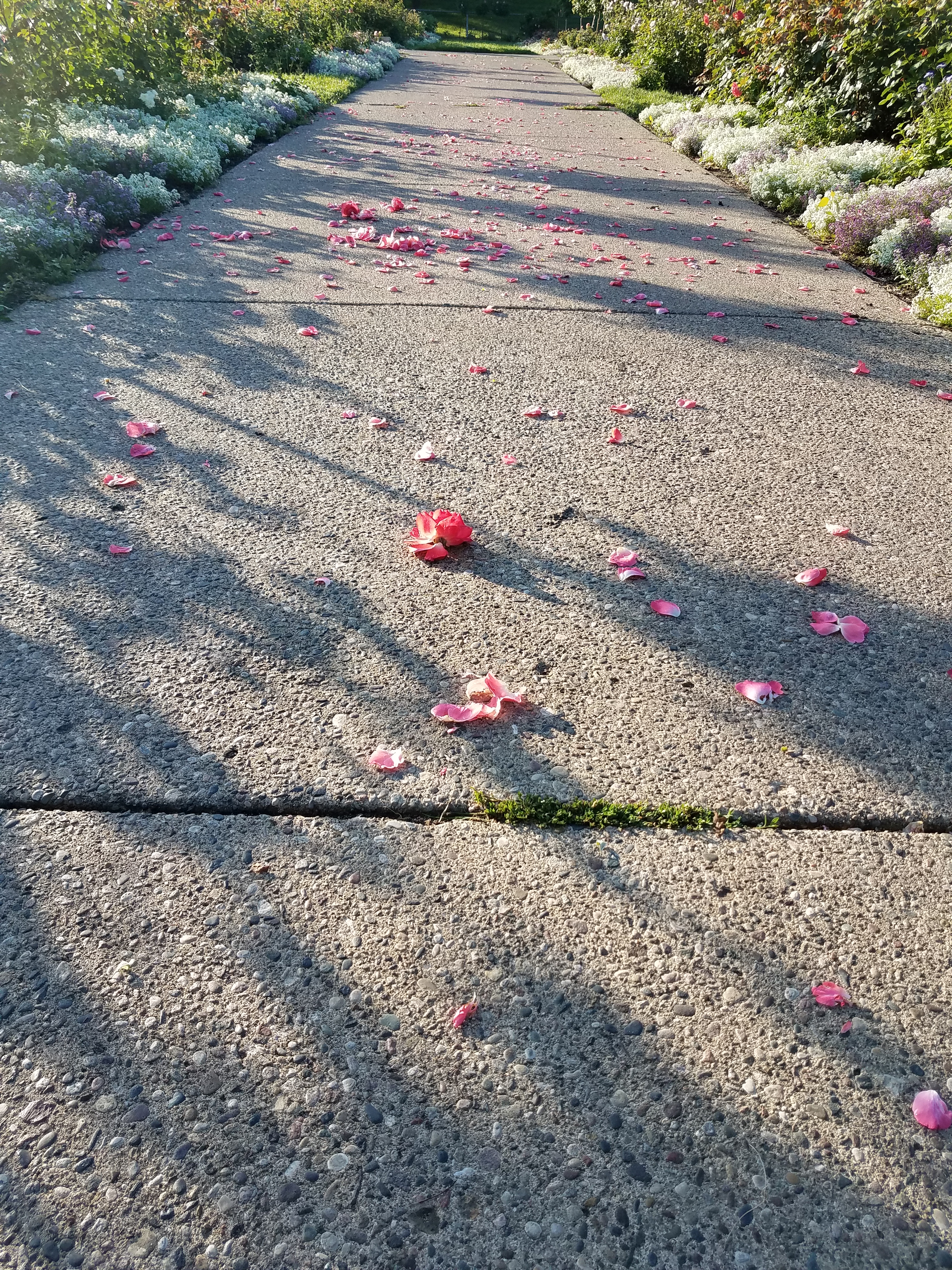 The petals and roses generate a lot of conversation between us and the early morning park visitors. People are really enjoying being able to take the freshly cut, yet wilted roses. And tossing around and walking on rose petals? It’s kind of nice, although I’m sure most people think the Kardashian’s (Registered Trademark) or a bunch of poets must have passed through or something.