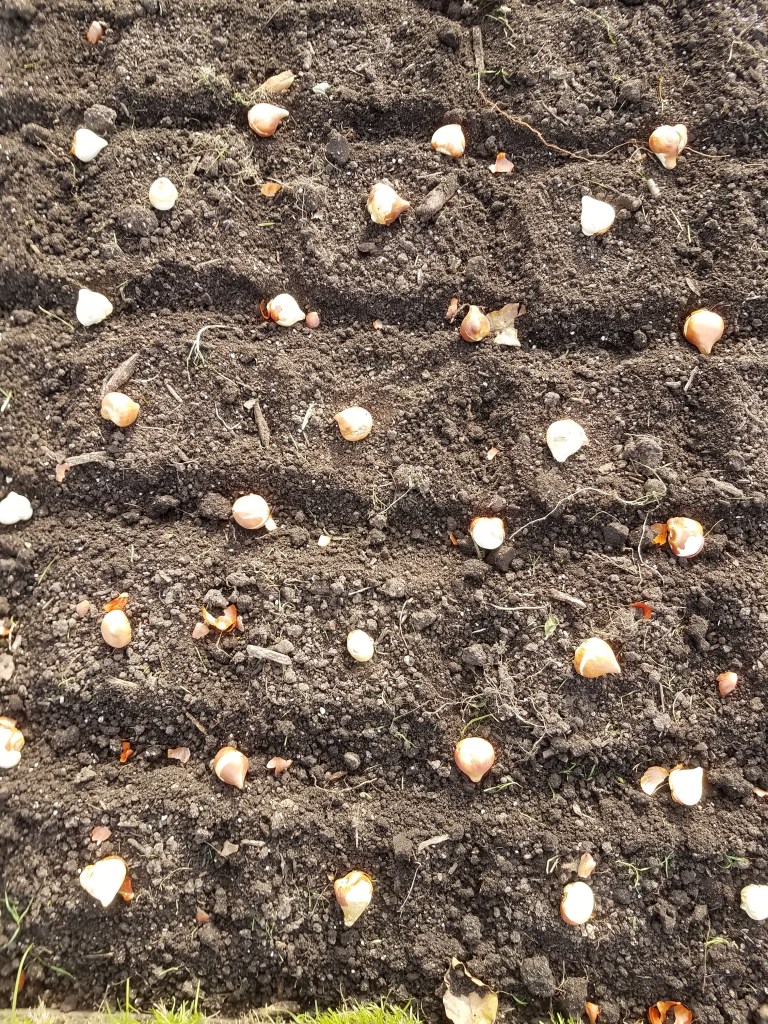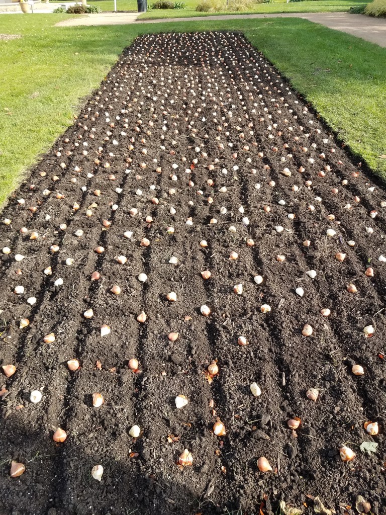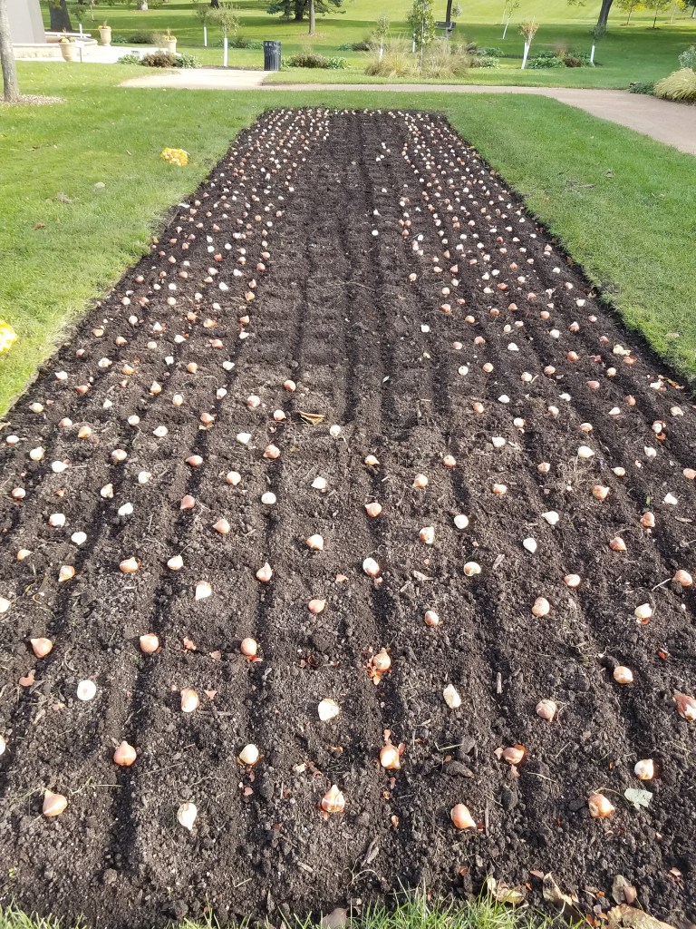 5000 plus Tulip bulbs for Lyndale Gardens. The larger beds in the annual – perennial gardens got about 1000 each with a six inch grid drawn out with a bulb placed every three inches.