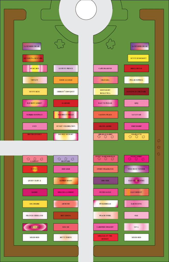 This version was recently created by the same gardener who created the display signage. Thank you Chelsea for sharing this. It contains the names of the roses in the main beds and their approximate coloring.