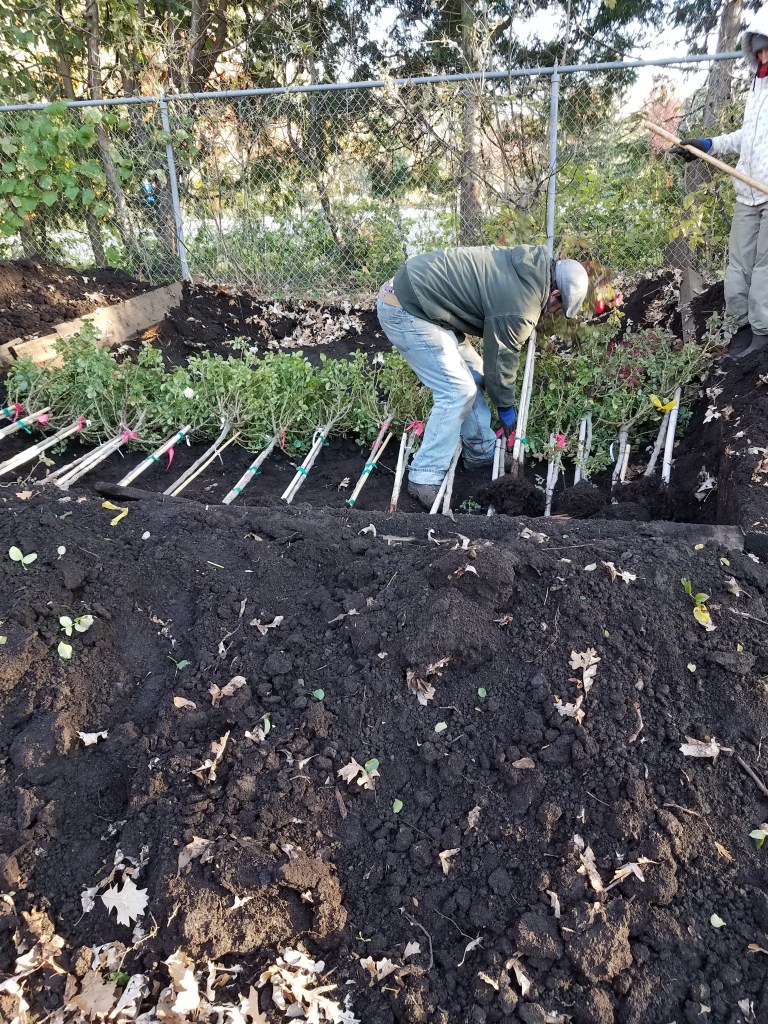 One of our last tasks was removing the twenty plus tree roses from their beds, and placing them in the pit. This is a winterizing procedure known as “The Minnesota Tip Method” and will protect them from exposure. It will also prevent those bourgeois burglars from stealing SIX of them like they did last fall. Seriously. We came into work one morning and there were six holes where rose trees used to be.