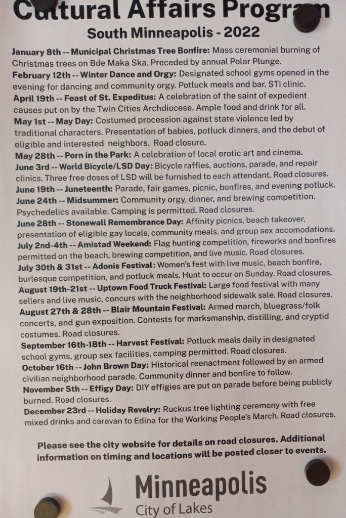 Speaking of this season in the City & Parks, I saw this questionable document on a bulletin board in a local coffee shop recently and was delighted at the detail and effort that someone put into this. It looks as if it’s going to be a busy and interesting year with a lot of road closures. I’m sorry I couldn’t inform you in time for the first two events, so will encourage you to add the rest of these into your calendars.